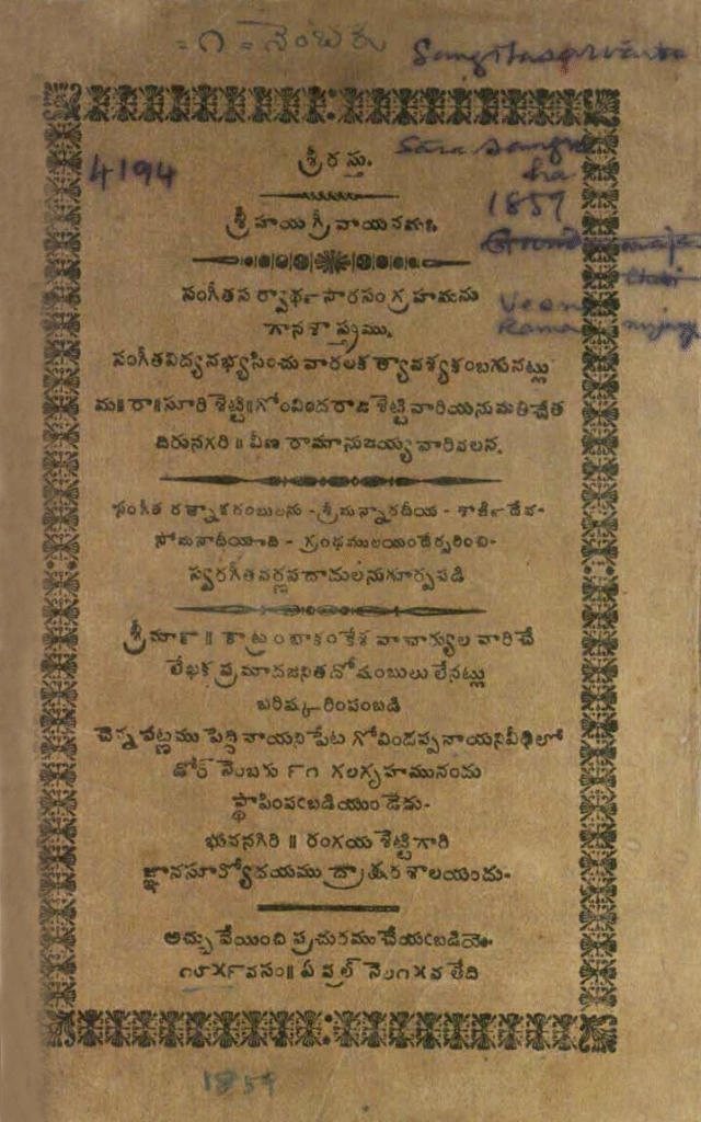 The Sangita Sarvartha Sara Sangrahamu (SSSS) is one of the earliest music books printed and published in Madras. It predates Subbarama Dikshitar’s Sangita Sampradaya Pradarsini by 45 years. The book Sangita Sarvartha Sara Sangrahamu, written in Telugu, by Veena Ramanujayya, was first published in 1859 — a copy (laminated for preservation) of this first edition is available in the Music Academy library (see cover page). Musician Savithri Rajan and Michael Nixon presented a lecture demonstration at the Music Academy, and wrote an article in English about the Sangita Sarvartha Sara Sangrahamu in Volume 52 (LII) of the Journal of the Music Academy in 1981, which we bring to you here (as a pdf attachment). In the attached article, gleaned from the archives of the Music Academy, they have mentioned that three editions of the SSSS were published in Madras — in 1859, 1885 and 1908 , but the second and third editions were published by different sets of people. There is also a copy of an 1897 edition (not mentioned in the article) in the Music Academy library which was printed at Sriranga Vilasa Mudraksharashala; this edition seems to have been scrutinised by Tachur Singaracharyulu and Alaga Singaracharyulu.
